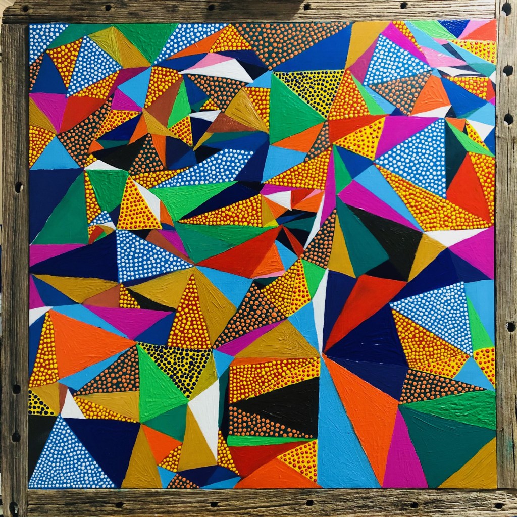 Art is a great way to express oneself. It lifts me up & has always been a great hobby of mine. Reflecting back on the past year it’s been particularly challenging for everyone during COVID-19. This artwork was composed with acrylics on a large scale canvas with rustic chunky wooden frame. It uses colours that pop & are bright, vibrant, festive & bold celebrating the happy days ahead. The frame & colours used are such opposites, that they make a statement to not be forgotten.