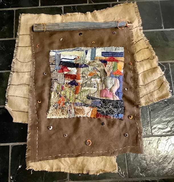 Medium: Medium: Fabric collage and 2 photographs transmitted onto fabric stitched into linen and hand embroidered in a variety of stitches. Set onto two layers of hessian. Found objects and wire stitched onto background.