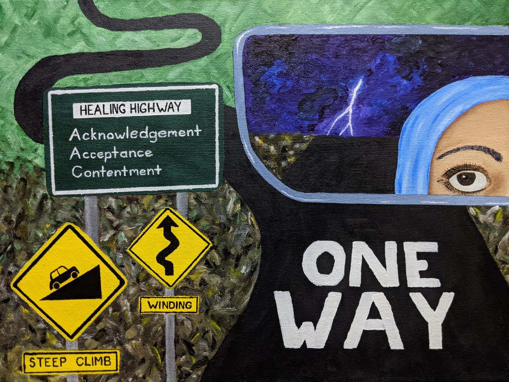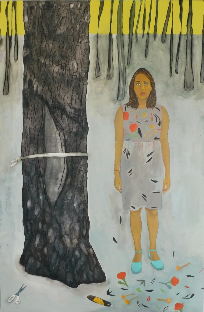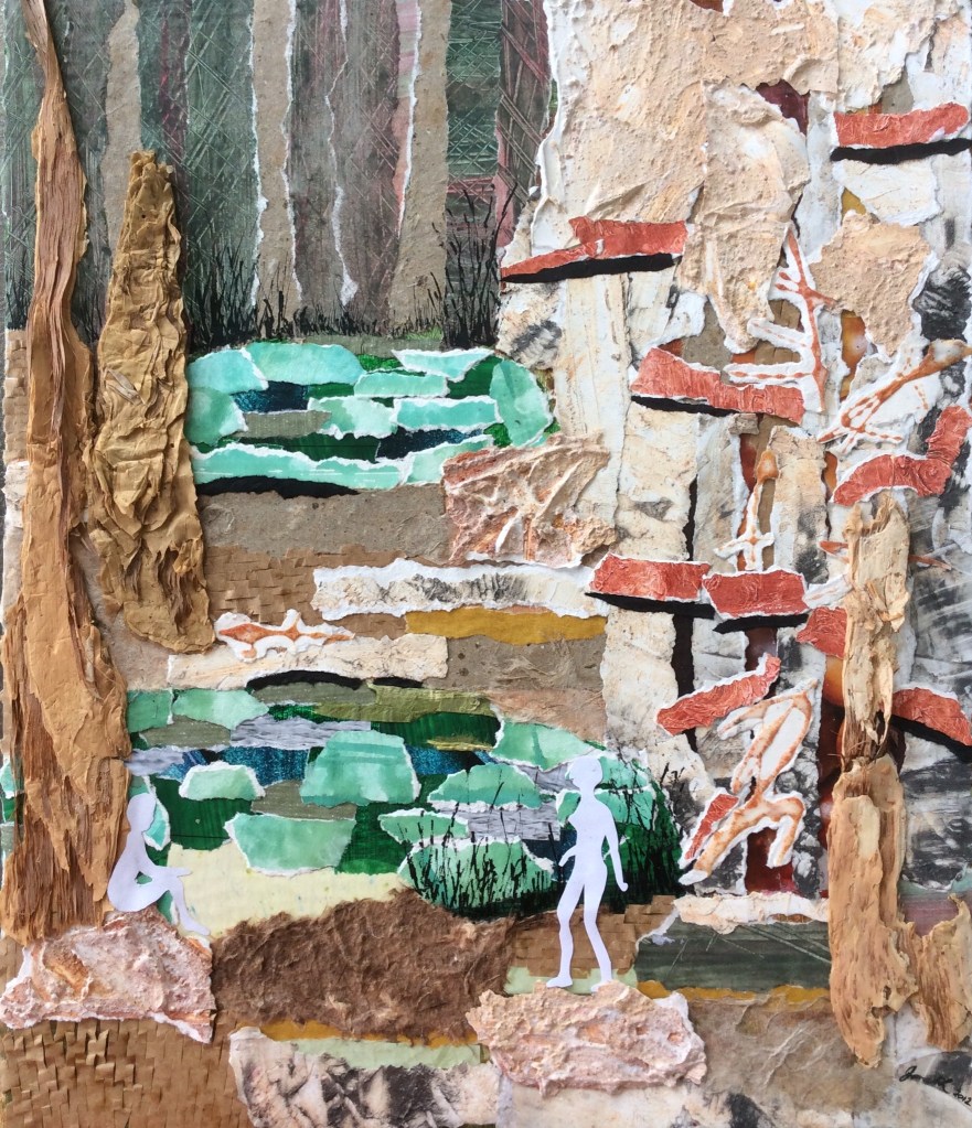 This painting depicts the beauty and power of the flowing river. How does it relate to the theme? One of the ways we can move forward is firstly to hopefully grasp the intersection of past, future and the present moment in silence (if we are lucky … by the river) and secondly to know that we are entrusted with the care of our natural world including waterways
