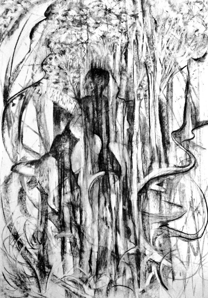 Artist Statement: I unexpectedly landed here in this land of Lyrebirds at the beginning of last year, not far from where I gave birth in an old cabin in the woods down the road, almost 30 years ago. During this last year bushfires indirectly causing a sudden move from a house of ten years had me living in a van very close to nature for a few months near the scene in this drawing. The ancient forest smelt like a fresh new start. I started setting up to travel in a van and make art. Enter Corona. And yet, despite the 2020 chaos I did my first ever road trip by myself, I achieved clinical remission of Crohns disease without medication defying convention and patronising doctors, faced biggest fears of moving, surgery, and face to face with a tiger snake! And by sheer chance and some super kind friends I found myself in a far better living situation in an old cabin in the woods, not far from where I gave birth almost 30 years ago, already moving forward.