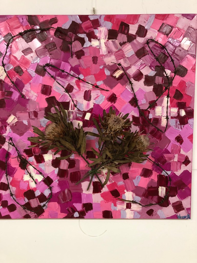Medium: Mixed media-oils, proteas, barbed wire, 90x90cm