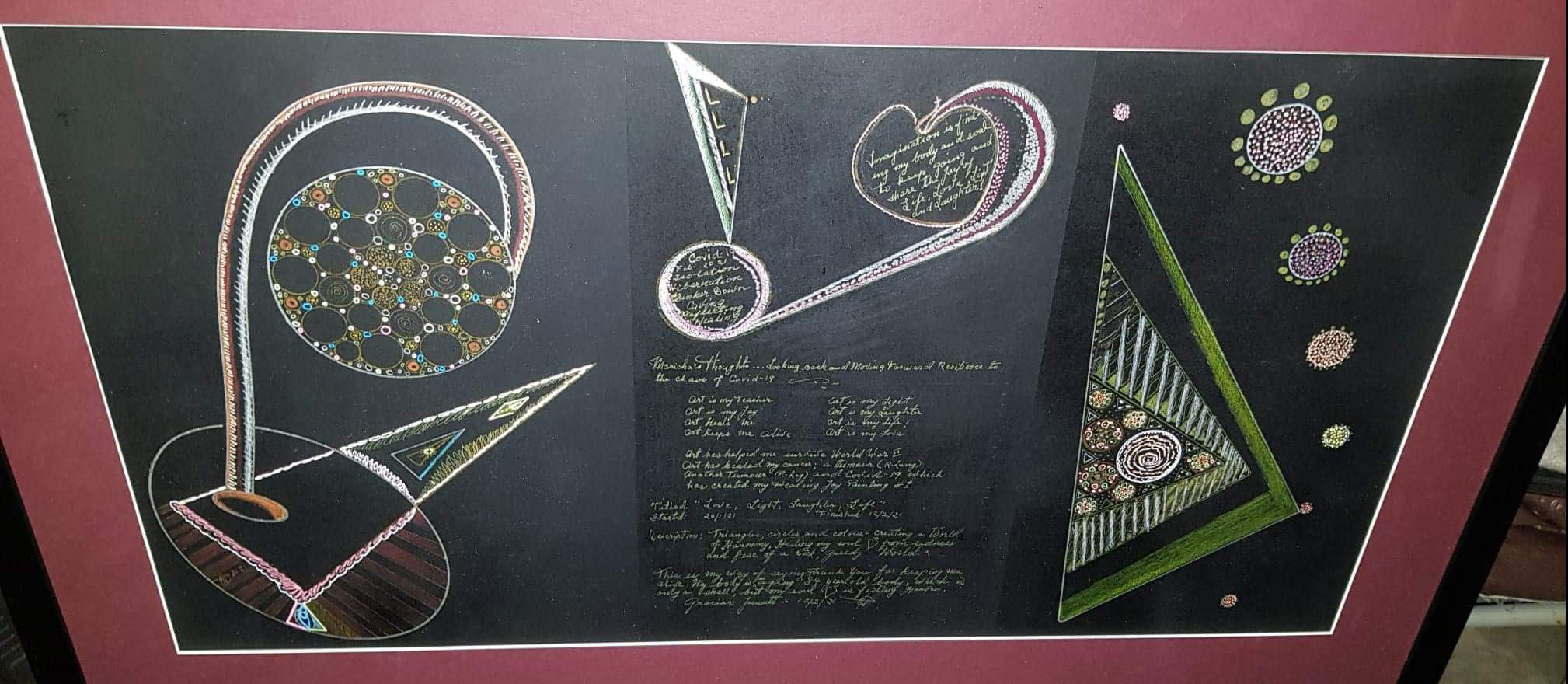 Medium: Painting using Chrome and gel ink pens on black paper.